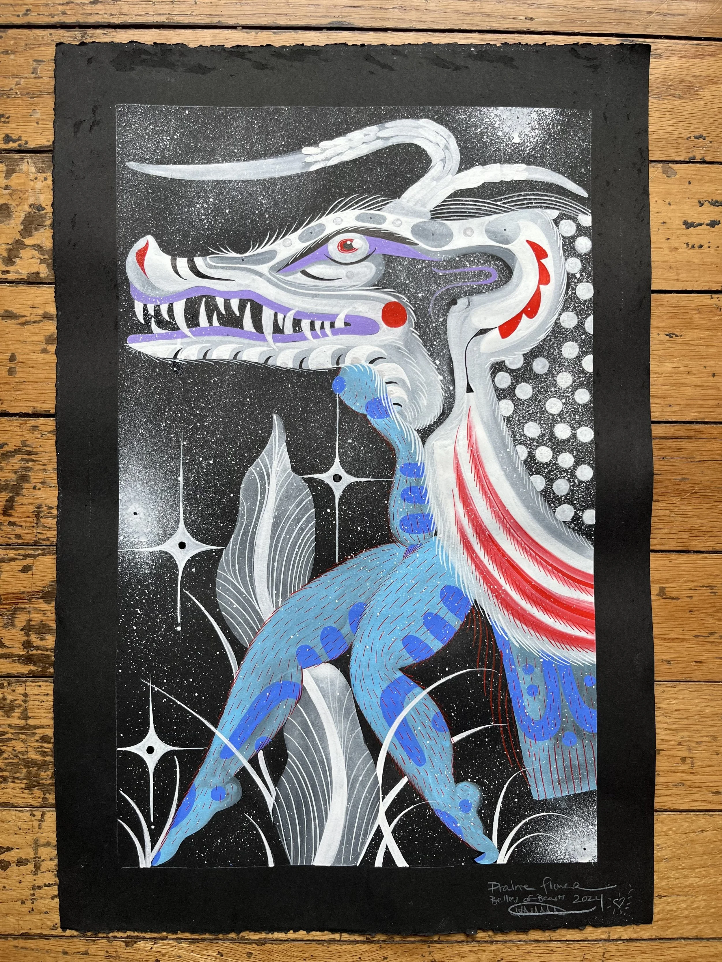 I’ve drawn my whole life, started tattooing at 25, at Age 30 I started Painting. My paintings are very different than my tattoos, and I believe they come from a separate part of me.